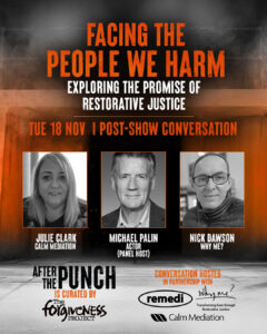 Why me? is delighted to be working with The Forgiveness Project and the producers of Punch as it moves to a run in London’s West End, as part of a post-show conversation about Restorative Justice. The play will be on at the Apollo Theatre, running from Monday 22nd September – Saturday 29th November 2025.