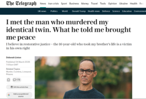 Why me?’s Ambassador, Nick Dawson, was interviewed for an article that was shared in The Telegraph this week. In it, Nick shared the story of how he met the man who murdered his identical twin brother, Simon. Nick’s story is a testament to how transformative Restorative Justice can be. Meeting Craig allowed Nick to get his questions answered and share the impact that the crime had on the lives of all who loved Simon.