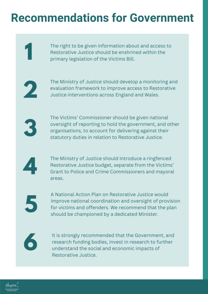 Increasing access to Restorative Justice should be a policy priority within the Criminal Justice System. Having conducted this research, we believe that this can be achieved by implementing the following recommendations.